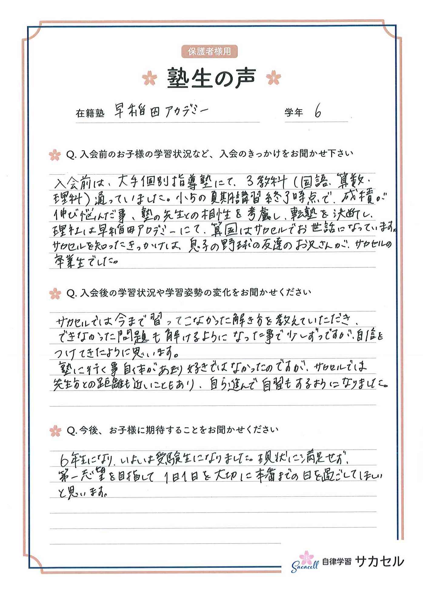 入会前は、大手個別指導塾にて、3教科(国語,算数,理科)通っていました。小5の夏期講習終了時点で、成績が伸び悩んだ事、塾の先生との相性を考慮し、転塾を決断し、理社は早稲田アカデミーにて、算国はサカセルでお世話になっています。サカセルを知ったきっかけは、息子の野球の友達のお兄さんが、サカセルの卒業生でした。