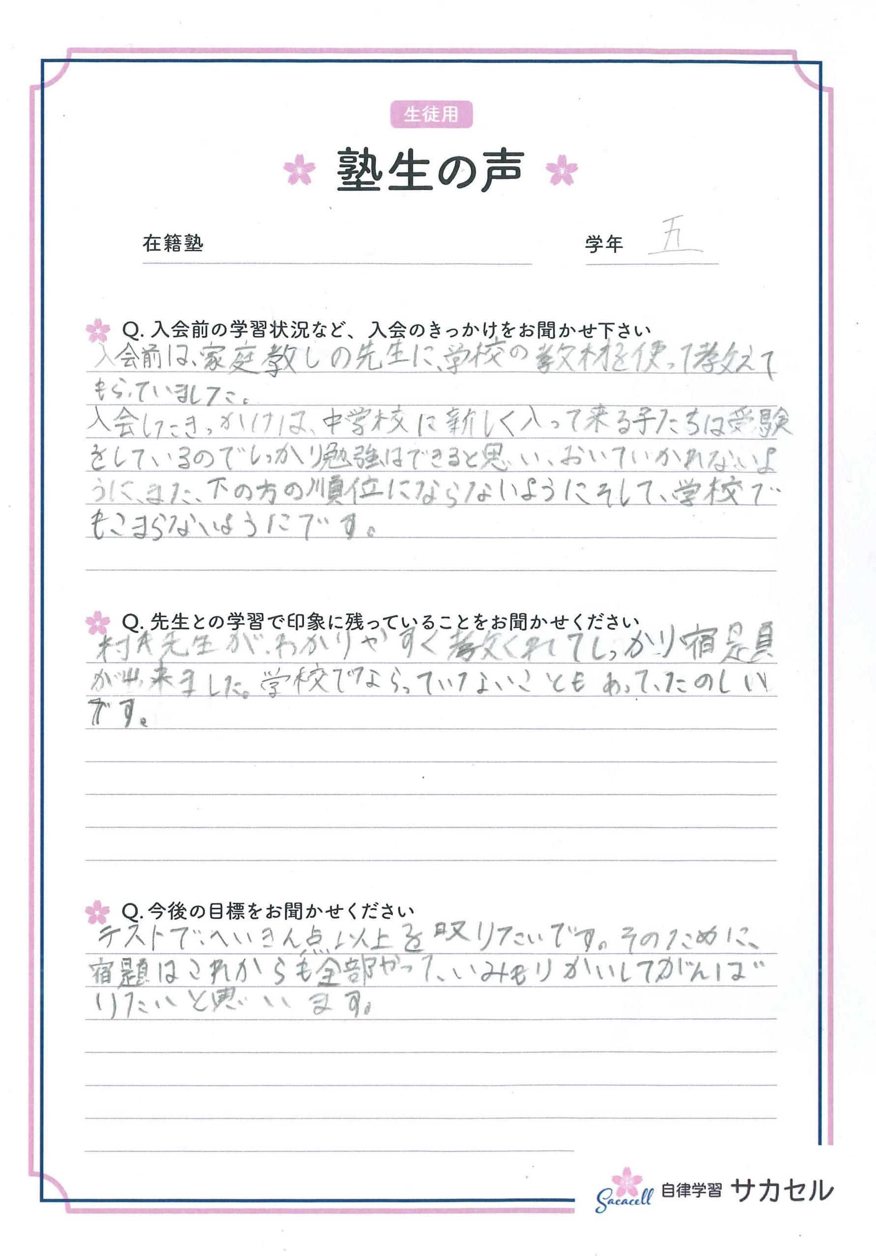 村井先生がわかりやすく教えてくれてしっかり宿題が出来ました。学校で習っていないこともあってたのしいです。