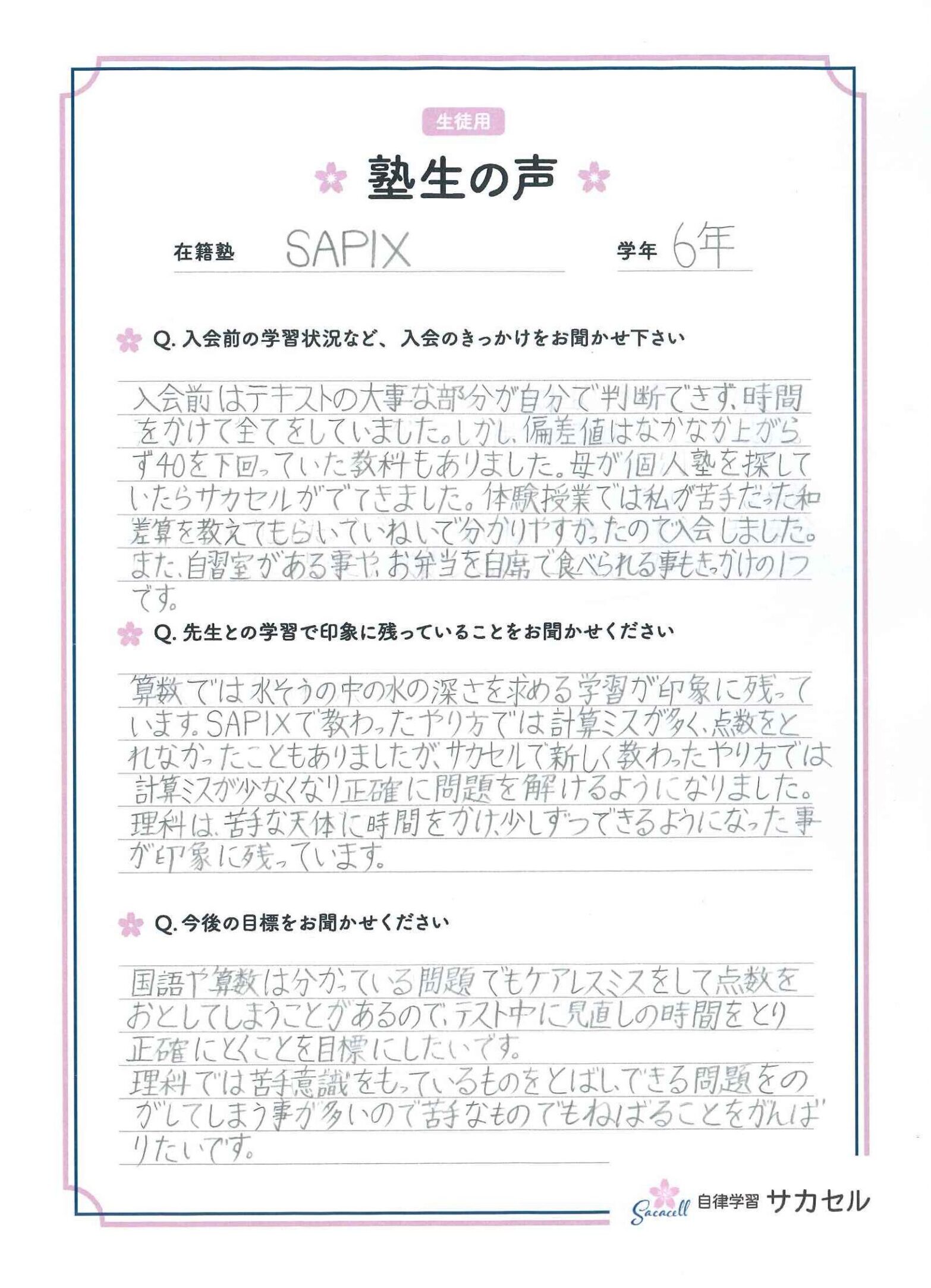 算数では水そうの中の水の深さを求める学習が印象に残っています。SAPIXで教わったやり方では計算ミスが多く、点数をとれなかったこともありましたが、サカセルで新しく教わったやり方では計算ミスが少なくなり正確に問題を解けるようになりました。理科は苦手な天体に時間をかえ、少しずつできるようになった事が印象に残っています。