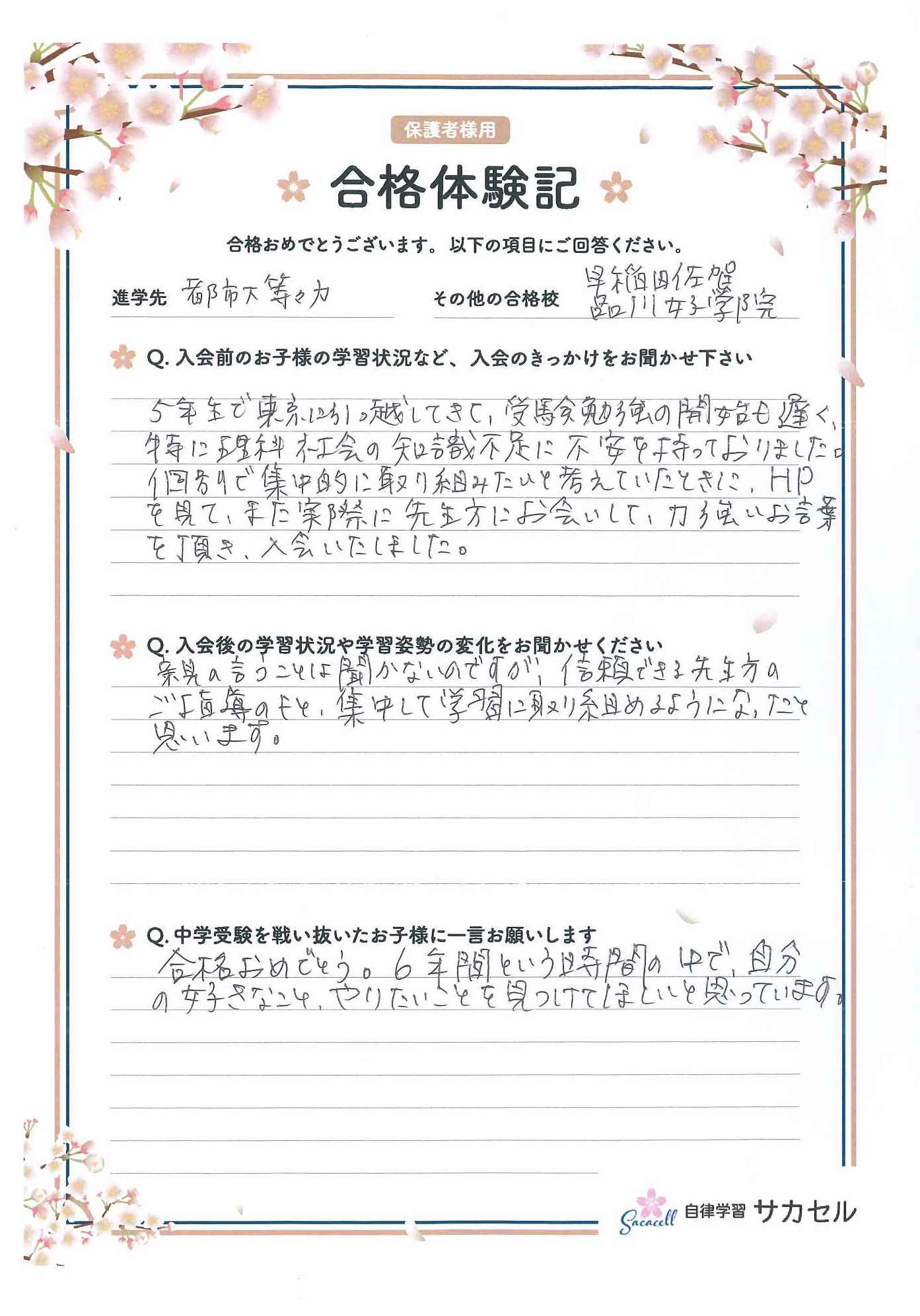 5年生で東京に引っ越してきて、受験勉強の開始も遅く、特に理科社会の知識不足に不安をもっておりました。個別で集中的に取り組みたいと考えていた時に、HPを見て、また実際に先生方にお会いして、力強いお言葉を頂き、入会いたしました。